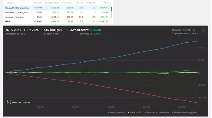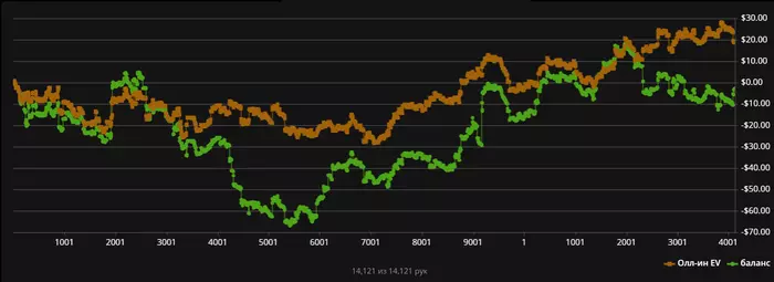 Наконец-то зеленая выше оранжевой, по EV -30$ с вычетом рейка, по факту получилось +150$. По сути играю в 0 на рейкбек, что для этого лимита результат так себе, хотя по 60к рук судить нельзя. Но меня вполне устраивает, если я в итоге буду играть пло25-50 в небольшой минус, который будет покрываться из Fish Buffet до 0, а лидерборд + джекпоты + турниры будут моим профитом.