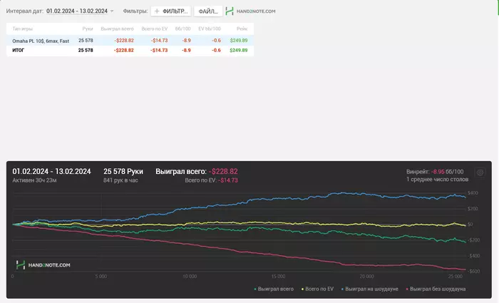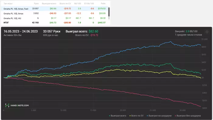 Знаком с Омахой с 2021 года, но более-менее серьёзно начал играть с лета 2023. Начал играть Zoom10 и планировал нафармить 2500$ для перехода на Zoom 25. Играл по 4 стола, получалось по 900 раздач в час, поэтому многие раздачи разыгрывались в режиме нитового автопилота. Результатом такой игры стали посредственные результаты, а именно игра в 0. Но на старзах был рейбек 60%, поэтому меня это устраивало.