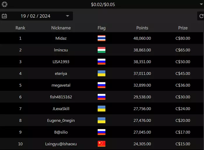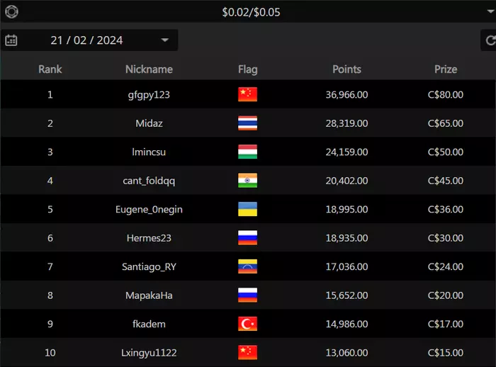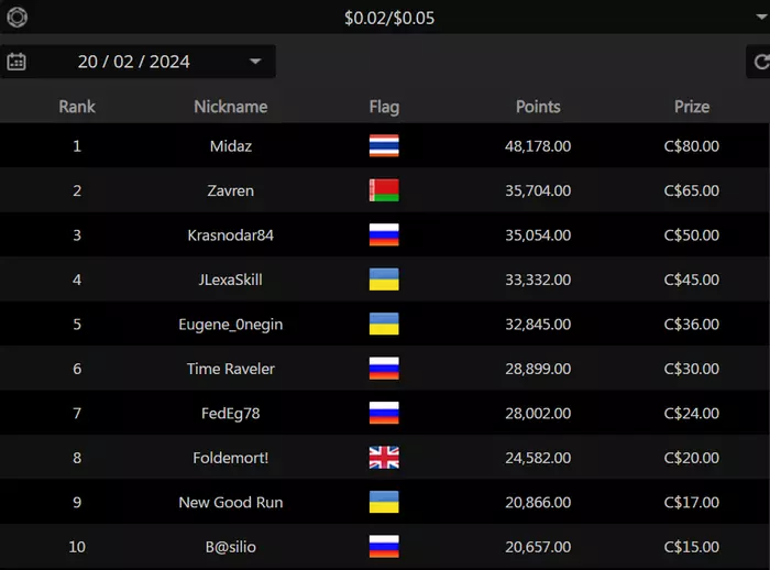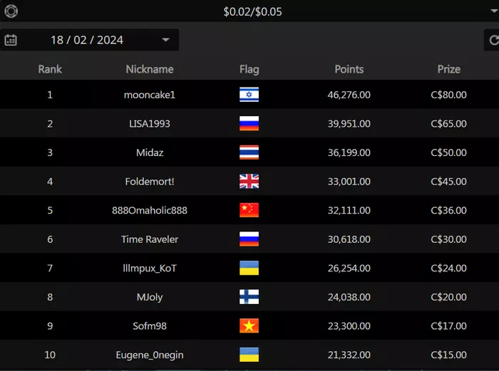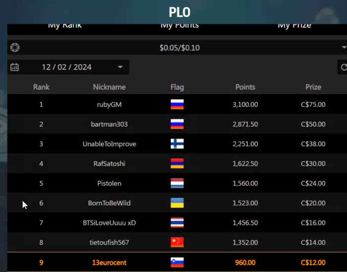 Следующий раз играл уже PLO5. Весь день шел на 1 месте, но ко мне все ближе подбирался таец с ником Midaz. Он играет с VPIP 60 и на постфлопе постоянно ставит 1бб ставки(что легко эксплоитится, ибо он скидывает на микроререйзы), из-за чего набирает больше очков. В итоге я решил не тратить ещё несколько часов на борьбу с ним за лишних 15$, особенно учитывая, что не факт, что я выиграю. Он спокойно, судя по истории лидербордов, может набирать 50к+ очков. Играл опять с 11 утра до 2 ночи. По кассе вышло -60$ (и по EV все хреново, и зелёная как всегда). Со всеми бонусами +75$. Хорошо насыпало в турнире.