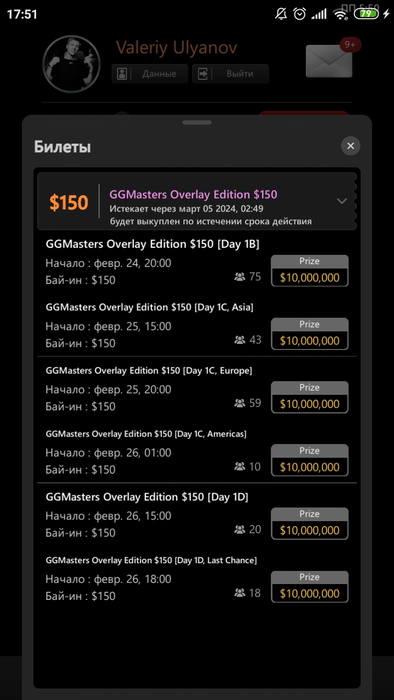 Продам билет на GGMasters Overlay Edition 150$. Отобрался через сателлит, выиграл билет, сыграть первый день нет возможности. Продам за 90$. Телеграм @svetikanti