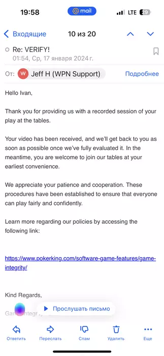 Около 12 января мне написали с поддержки покеркинга и попросили предоставить информацию обо мне, фото паспорта, видео своего рабочего места. Я все сделал. После они мне сказали нужно записать игровую сессии МИНИМУМ 2 часа. При этом нужно вести запись не только экрана, но и рядом снимать себя на телефон, что б видно было меня и экран. Я конечно же все сделал и примерно 14 января все отправил.
