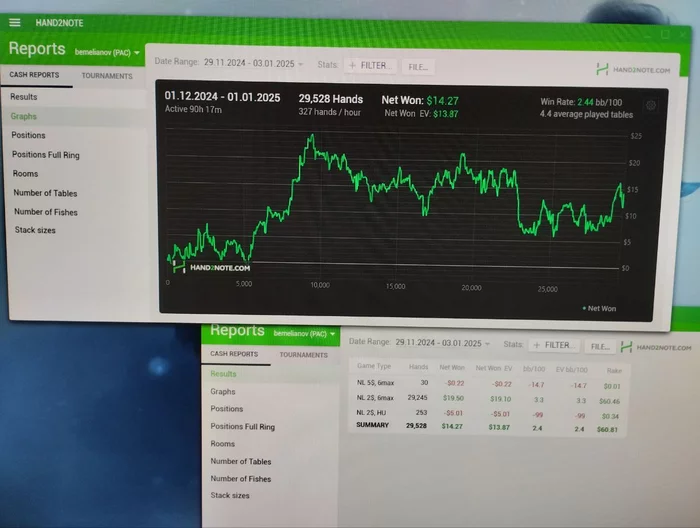 По Банкроллу: летом впервые депнул GG 25$, сейчас +2$ в 5к рук; перешел на 888 25$, сейчас -4$ в 8к рук, с НГ занимаюсь полупро)