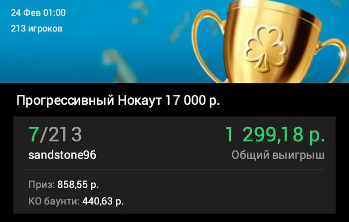 Так же отрегал Покердом, депнул 10 долларов. Внезапно очень приятные поля, куча фишей. В турике за 500 руб (5,5$) ни разу не переехали, мега приятный гсч (после опыта секса с ГГ). Отрегал турик за 150 руб и за 500 руб (других особо в 4 часа дня не было). В турике за 5$ дошел до топ 10, но сказалось отсутствие опыта игры в дипах на предфиналке. Потому что на гг в основном пиханина в глубине 10-15бб, а на ПД стеки даже в говнобаунти за 2$ 30-40бб на предфиналке.