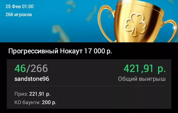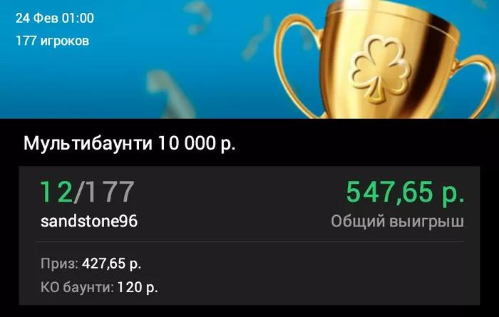 После работы сел. 17 турниров. Короче мне лень постоянно переводить в доллары, буду считать просто в вечнозеленых.