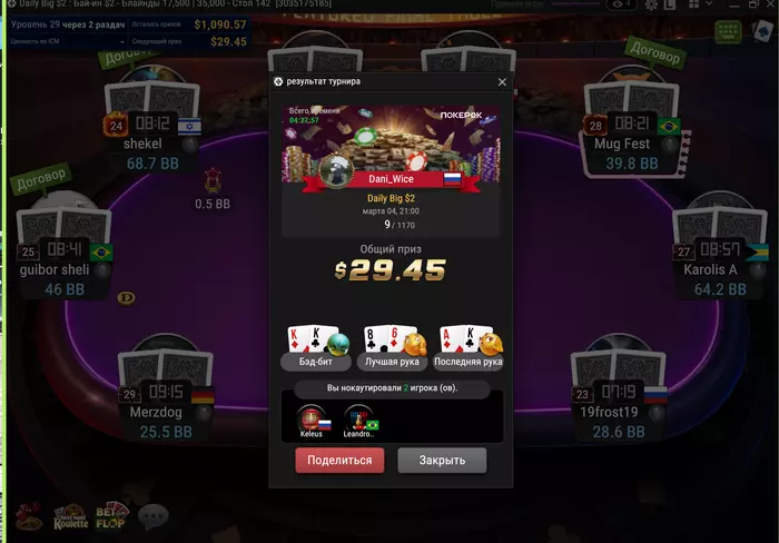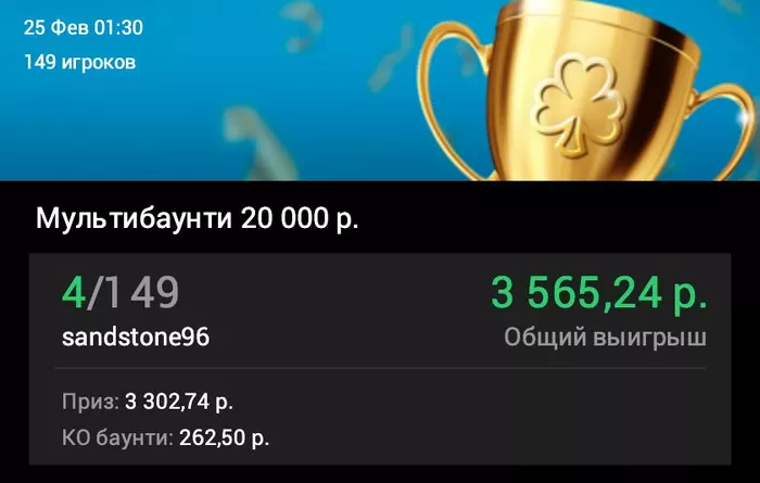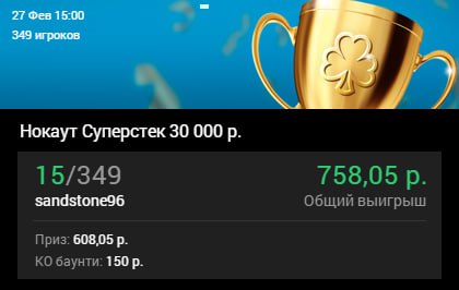 Потом переапался в 4 вей против 3х коротких, поехал К4о за громадное баунти, самый старший (по терну две пары), минус три игрока на финалке и я забираю космически огромное баунти за чипака. В ХА не смог нормально переиграть оппа. Стеки сравнялись, я перешел в пуш фолд. Два раза поехал снизу А9с>АК, потом 87>А5о, оба раза вин. Ну справедливости ради там 1500 руб баунти всего давали, не так чтобы много но приятно топ 1. Докатываю полуночный экспресс и подгружаю немного новых турниров