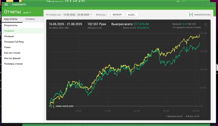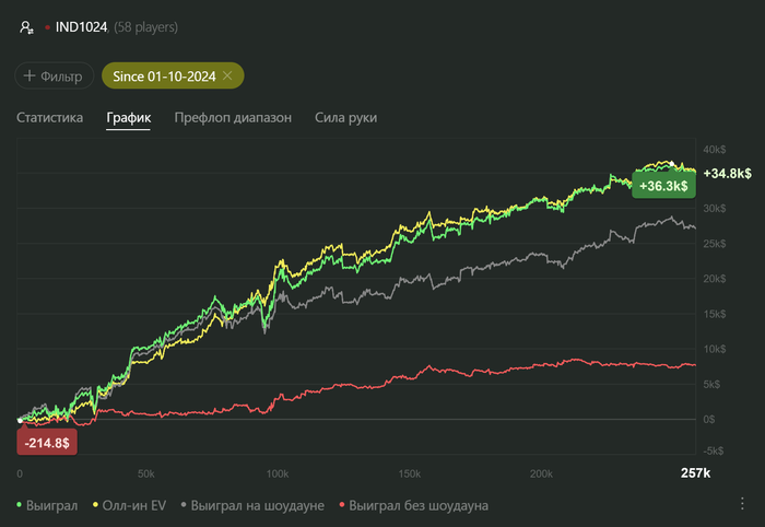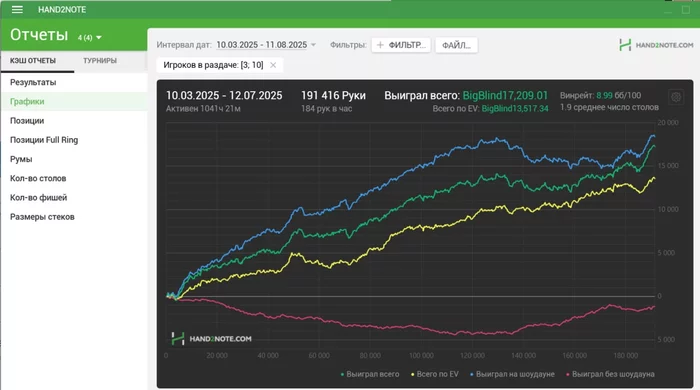 Покерброс, график до (играл без конвертера, поэтому на даймонде (где основная дистанция) и парадайзе при посадке на стол в анонимном лобби первая рука не трекалась - а это всегда ББ, поэтому общий результат минимум на 0,5бб/100, а может и больше хуже, про красную и говорит нечего)