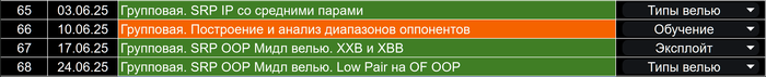 Это одни из самых лучших тренировок по кпд и влиянию на ваш винрейт, они определенно очень хороши для регов нл25-400, позволят вам достаточно быстро в течении 2-5 месяцев точно поднять выйгрыши. Инфа по возможности подается структурированно, тренировки по абонементу идут по темам, определенно лайк за такой подход. Сам подход похож на подход некоторых игроков у кого я тренировался с лимитов выше 1к , именно поэтому я сразу остался на подольше у Вадима. Тренировался я много у кого, от субара и прости госпади жана( o:god) , до стефана и других высоко катающих регов, есть как говорится с чем сравнить. За свои деньги трены топ, расписывать больше не хочется, просто рекомендую.