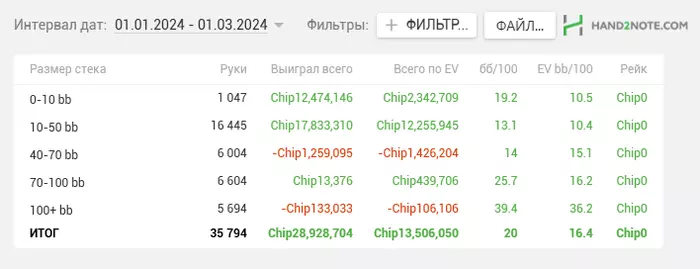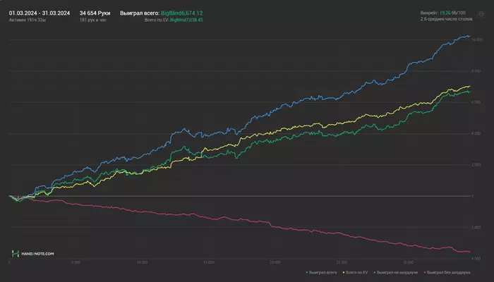 В марте сыграл 369 турниров. Почти в полтора раза больше чем в феврале, но профит вышел почти в два раза меньше. В апреле думаю не гнаться за количеством, а сделать упор на качестве игры. Самое главное научиться уже ВЫКИДЫВАТЬ РУКИ на агрессию, когда блефов там нет.