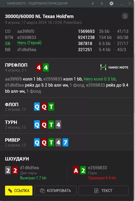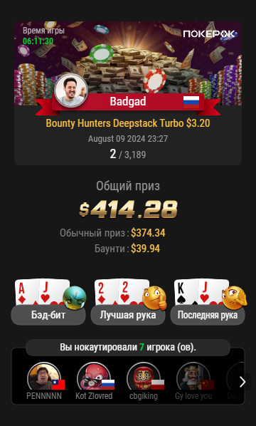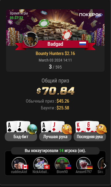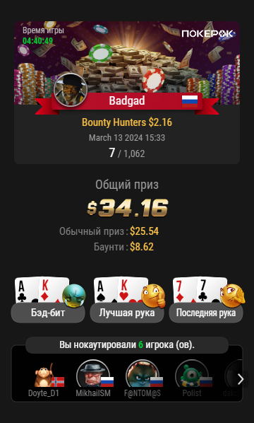 Апрель начал неплохо. Вчера был топ18 в килополе баунти хантерс спешл по 3,21$. Выставился префлоп за чипстек AKо<66. Не повезло(