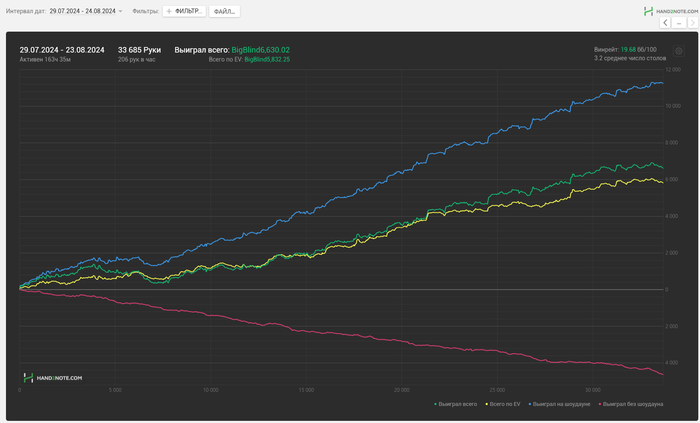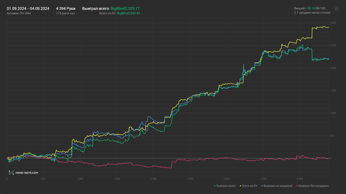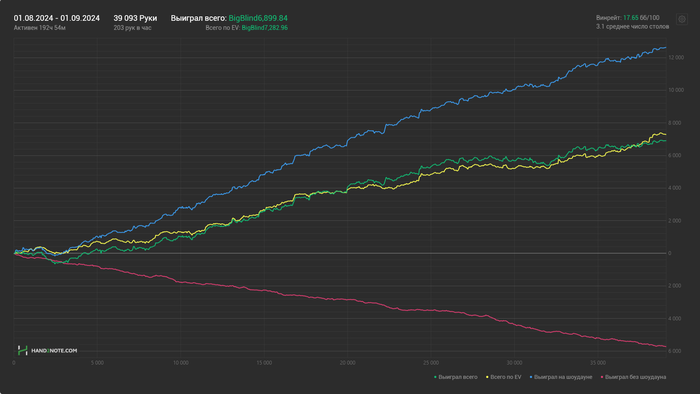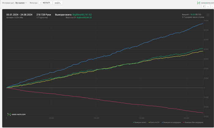 Отчет за август. Сыграно 376 турниров. Профит 2К$, с учетом выигранного билета в 50$ на кубок Котэ. Ночью получилось добить до красивой цифры)