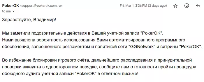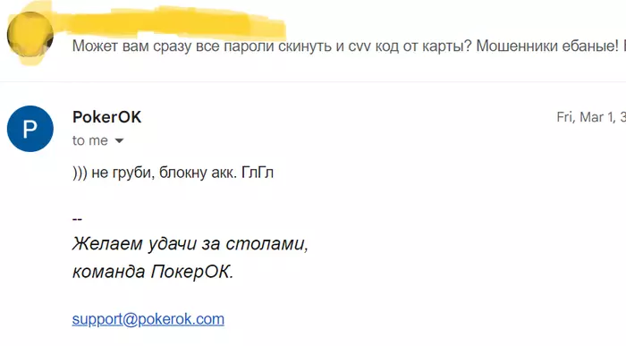 До этого 1го марта прилетает сообщение от покерка с адреса com.ru - возможно мошенники?