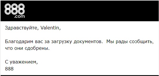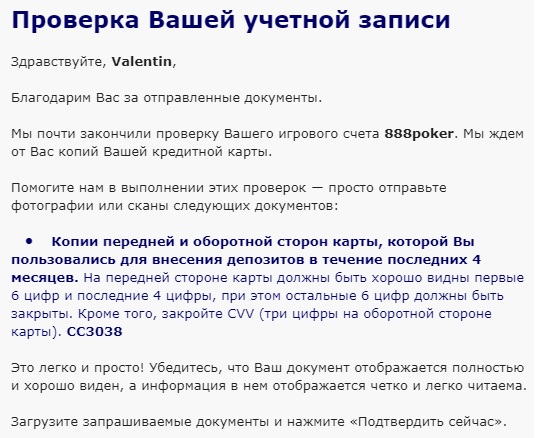 Моему акку на 888покер больше года переодически байтился на фрирролы в течении года по копейкам выигрывал то опять сливал и т.д Никогда даж не пробовал пополнять баланс и не заботился про верификацию я новичек. Но вот вначале марта черт меня дернул зайти туда, увидел турик на 300к$ с призовыми, в общем с фриролла по сателитам в итоге выиграл 2500$. И тут понеслась моча по трубам, вывод не доступен из-за того что я не верефицирован. Закинул все доки что просят, спустя часов в после паспорт уже была галочка готов, а вот остальное отклонено(появилась красная надпись "Удостоверение личности - файл не может быть использован". А в письмах на почту шлют мне всё время чтоб я отправил подтверждение адреса, квартира оформлена не на меня поэтому в квитанциях об оплате комуслуг не моя фамилия, я им фотаю отправляю, выписка с банка у моего банка только на русском, фотаю отправляю. Они отклоняют и заново просят опять отправить тоже самое без указания проблемы и т.д тех поддержка сообщила что нужно на англ йском. На английском только электроная выписка с приложения банка но без адреса, но в pdf я смог вручную добавить адрес, тоже отклонили. Домком от руки выписал справку с в под верждение адреса с моими данными на английском, тоже отклонили. Кароче мудохаюсь уже почти 10 дней, у них раз в сутки ответы по шаблону.
