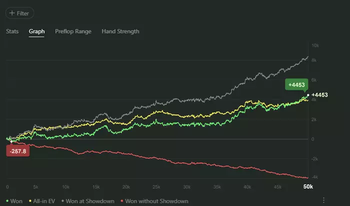 EV позорное, много теряю, когда рублюсь за каждый банк. Рекомендация тренера - научиться сдаваться. Будем стараться. ROI радует, конечно, дипраны я отыгрываю качественно и собрано, поэтому получается заносить