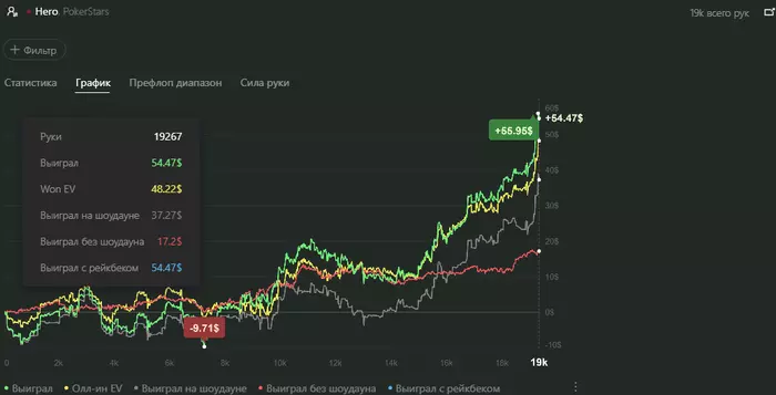 Всем привет, меня зовут Kirill мне 23 года , родом из Росиии. Учусь на юриста 3 курс местного вуза. Недавно осознал некоторые части устройства мира и понял, что работать за 25 к в 25 лет = быть рабом матрицы. С покером был знаком давно, а конкретно с 8 лет. Первая поездка в лагерь, старшие ребята играют на полдник, малому объяснили правила и я быстро ошизел и начал проводить все время за картами. Никаких дискотек и тупняка с пацанами. В свои 8 лет я сидел и изучал правила игры. В скоре к концу смены начал обыгрывать старших ребят и выиграл кусок домашней пиццы и сок. Потом поигрывал в 8-9 классах, даже был занос на 700 баксов в каком то 3$ турнире. На тот момент я сошел с ума и прокрутил все в рулетку, но и отметил этот занос со своей девушкой, нам было по 14 и мне повезло достать бутылку джим бима, что было дальше - плод ваших фантазий. После школы понял, что хочу работать юристом и в будущем( как и многие ребята , я полагаю) мечтал стать адвокатом и по уровню пафоса в мыслях была чуть ли не защита Дьявола перед богом. Но скоро бюрократическая система, вечные п****тые преподы , и колхозники одногруппники разочаровали и злили меня окончательно. Я набрал много в весе и впал в депрессию. Но тут в декабре 23-го я вспомнил про покер, скачал новй на тот момент для меня покерок и депнув 30 бачей за 5 дней смог в мтт плюсануть 70. И вот я уже осознаю какие бабки я могу получать за пару дней игры., посчитал $/час, и подумал , ну вот оно , я же не раб, не БЫДЛО, и пошел играть. Увидел ролик FELLINI о том, как выбрать мтт или кэш , сравнил все плюсы и минусы , и выбрал кэш игру. ЗА первый месяц слил остатки бра и депнул уже 100$. НО тут меня ожидал ПОЛНЫЙ АД! Оказалось, что я лудик)))))). ПРоиграв 2БИ на нл 2 я быстро бежал отыгрывать их на НЛ5. Посидев обосранный с впипом 10 на нл 5 и залив пол стека, принимал самое лучшее решение и.... ПОШЕЛ ИГРАТЬ НА НЛ 25 АХАХАХХАХАХАХАХАХАХАХ. Просидев там в мокрых трусах и залив 25 баксов был рад уже прыгнуть под машину, но вдруг я понял, что пора брать в жизнь в собственные руки и записался в спортзал. Потом почитав купил месяц подписки на визард, начал тренироваться играть на GTO score, немного понял концепцию игры в 3бет потах, защиту СБ vs ББ и тып. Но продолжал играть на нл 2 в около 0. Бр оставался 30 баксов и я продолжал тренироваться. Вдруг увидел видео BABYSHARK и BUMBAK, где они играют микролимиты, и тут пошло, я начал плюсовать, по несколько часов в день изучал игру, отработал префлоп( правда нл 50, но я сузил из за рейк нагрузки), и плюсовал. Вскоре наткнулся на обучающие тренировки Николая dyrdom1 Евдокимова и осознал, что я делаю все правилоьно, спасибо вам реги хайстейкс , за контент! Сейчас ситуация таковая , я полностью отыграл , все что лудил, сейчас бр 107$, планирую сделать 150 и пойти на нл5. Играю раш, т к , иногда есть вайб побороться за ЛБ, но понимаю, что лузовенькая тема и скоро буду переходить на RED STAR. Вот мой график за 15.02- 15.03 ( в этом время я играл много и максимально качественно)