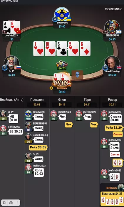 ХАХАХАХ, начну с этой раздачи, чекнул флоп т к , думаю что он начнет проблефовку, если попал в ренж( он супер нит , и я подумал, что даже защита бб у него пиз**ц нитовая. Играем чек, терн я хотел прочекать т к хочу увидеть от него доблефовку на ривере по любой спарке. Он ставит 8 центов и тут у меня позникает мысль, а что если он попал в 6ку и щас я ему зах***рю в олл -ин, и тут )) ахахаха это было так. Эта раздача скорее плохо мной сыгранная т.к на терне я должен ставить недорогой овербет , чтобы получить колл от 10 , но я видимо был в своих мыслях и чекнул, как оказалось, удачно.