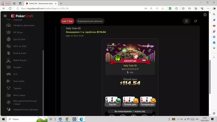 Лучший результат пока на данный момент в мтт, это 5 место в турбинке за 5$.В какой –то момент в топ -5 был лидером по фишками,но за пару выставлений закончил пятым-такие вот они турбо-турниры😭
