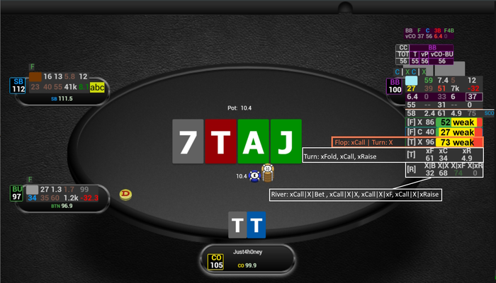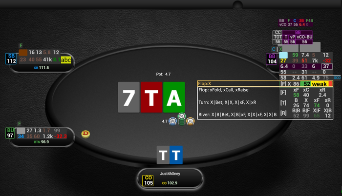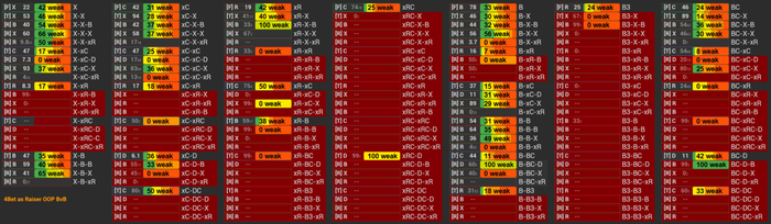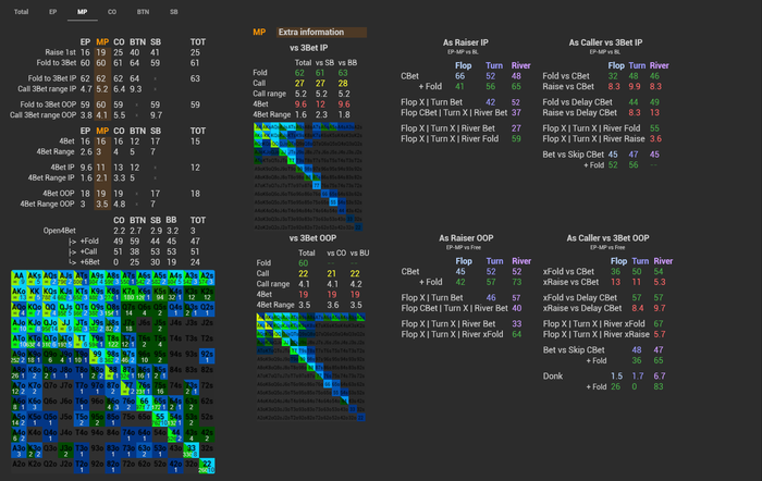 Во вторых по поводу пака. Уже довольно давно не писал ничего, но работа не прекращалась. Оптимизация: был проведен дополнительно Range research на 36 млн рук и были выделены линии постфлопа, на которых меньше 100 сэмплов по риверу, а это значит, что набрать нужную статистику по данной линии практически невозможно, так как 100 сэмплов на 36 млн рук - это примерно 0.0003% что вы попадете в данную ситуацию. Исходя из этого было принято решение удалить данные линии для снижения нагрузки на ХАД. Также будет удалено задвоение текстовых строк с обозначениями стат. Обе эти процедуры примерно снизят объем ХАДа на 30-40% по предварительным расчетам, что позволит ускорить работу самого ХАДа. С результатами Range research можете ознакомиться самостоятельно в google-таблице. Разивитие поп-апов. Ранее в версии 1.0.4 были введены динамические поп-апы для постфлоп игру в Single raise и 3Bet потах, в ближайшем обновлении будет также изменены поп-апы префлопа на динамические, а также внесены незначительные изменения в поп-апы постафлопа. Часть новых поп-апов уже готова и вы можете с ними ознакомиться на скринах ниже под спойлером. Все скрин-шоты в хорошем качестве можно посмотреть здесь.