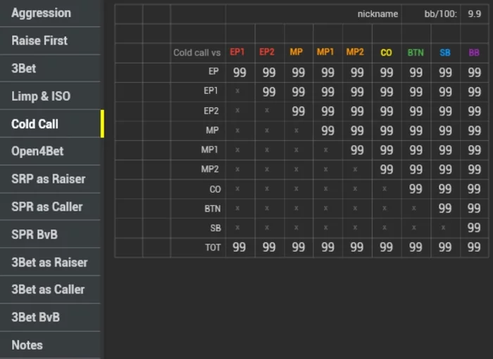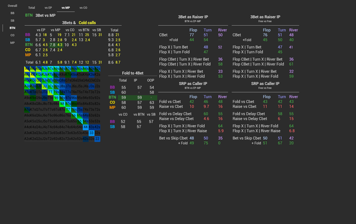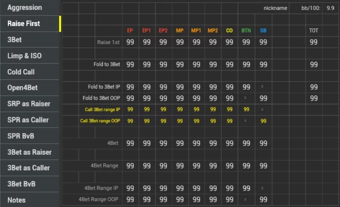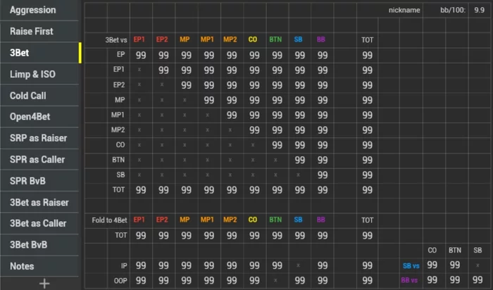 Когда ХИРО сидит на CO, BU или SB, на игроков, которые сидят после ХИРО выводится отдельный ХАД со следующими показателями: Fold vs RFI, Call vs RFI, 3Bet vs RFI (Позиция против позиции) и Fold vs 4Bet (IP/OOP)
