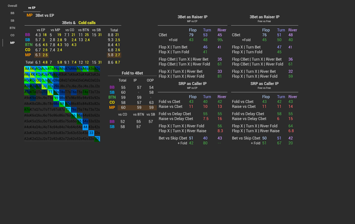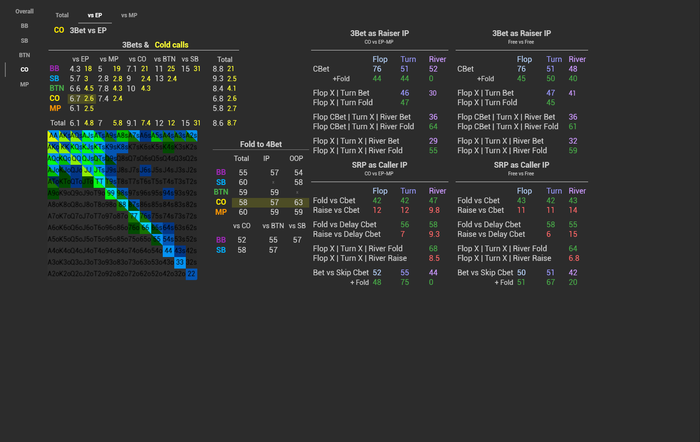 С прелюдией, пожалуй, закончили, теперь давайте расскажу про сам ХАД. В настоящее время в ХАД рассчитан на 6МАХ (каждая позиция и действия, связанные с ней выделены своим цветом: BB - фиолетовый. SB - голубой. BU - зеленый. CO - желтый, MP - оранжевый, EP - красный), добавлено более 6.500 статов, но за столом вы не увидите и более 30 из них, которые Вам нужны здесь и сейчас. Но если быть честным, то ХАД я делал под один из румов, где играют в кеше 7 МАХ, так что можно играть и на монетке с определенными условиями.