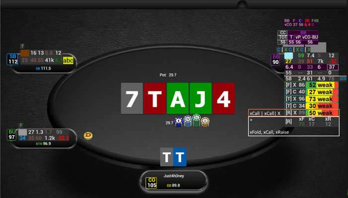 Продолжим, мы поставили и оппонент заколлировал. ХАД сразу же показывает с чем оппонент коллирует (оранжевая рамка наскрине ниже) и еще до выхода карты Терна показывает возможные действия оппонента: