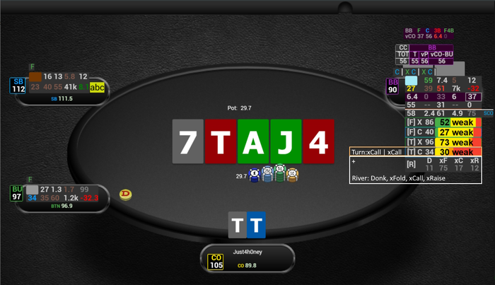 После колла оппонента ХАД снова обновляется и показывает как часто оппонент чекает и с какими руками, а также его возможные дальнейшие действия на Терне и Ривере: