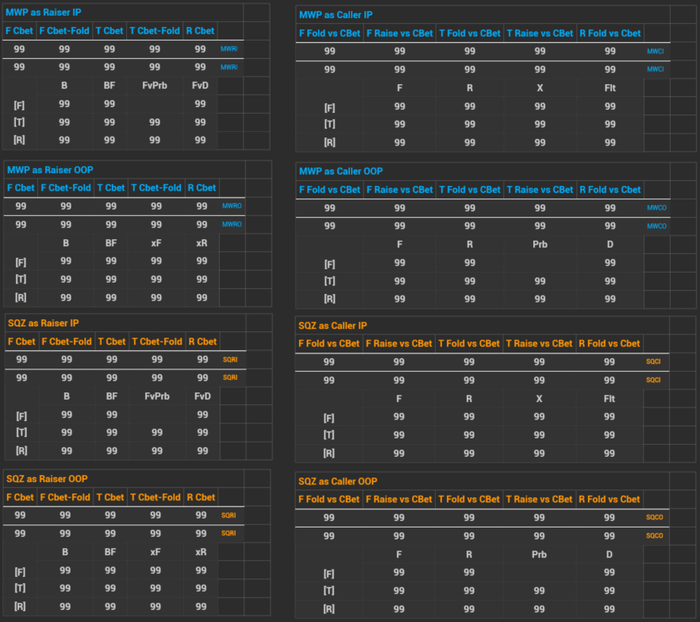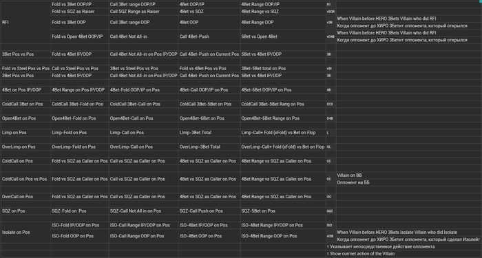 Предварительная информация по игре на постфлопе в зависимости от действий и позиций оппонентов, т.е. если игрок действует до ХИРО, то мы видим следующие 2 строчки: