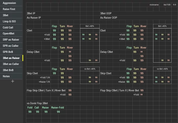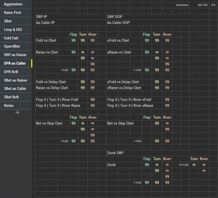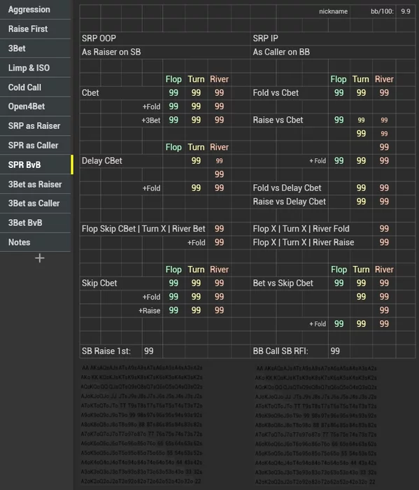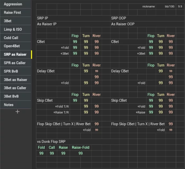 * Как оппонент играет как рейзер в Single Raise Pot (SRP) IP/OOP (BvB исключены) - обозначения: SRI / SRO