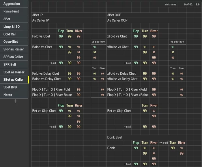 * Как оппонент играет как коллер в 3Bet IP /OOP (BvB исключены) - обозначения: 3CI / 3CO