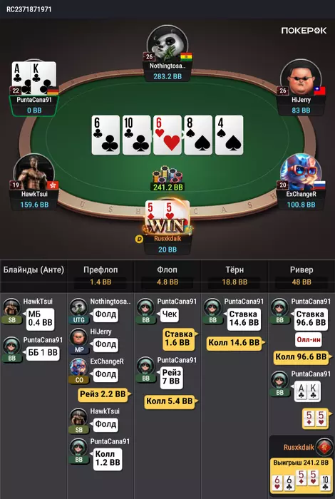 После того как я увидел AKs, все стало понятно. Агрессивный любитель отдал свой стек руке 55, хотя мог просто сделать 3 бет, на что моя рука ушла бы в пас. Не помню на тот момент, какие были статы HUDа у оппа. Может быть нитяра, любитель нитяра, не знаю.
