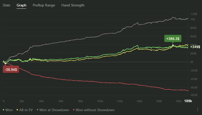 Начал играть в середине декабря 2023. Выбрал PokerStars, у меня там был аккаунт, думал просто восстановлю, в итоге просто создал новый. Закинул $10, раскачался до $250 за месяц, на кэше + турниры из сундуков. Сначала играл просто по наитию, потом законспектировал какое-то видео с простой ABC стратегией и пошло в гору. В середине января 2024 я скачал чарты GreenLine и с этого момента плато, играю в ноль, наиграл уже 40к рук так. Брал тренировку за $10, помогло, на какое-то время начал плюсовать. Потом снова скатился.