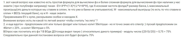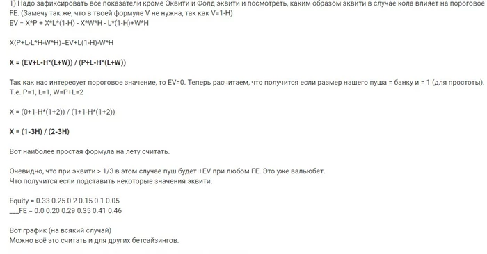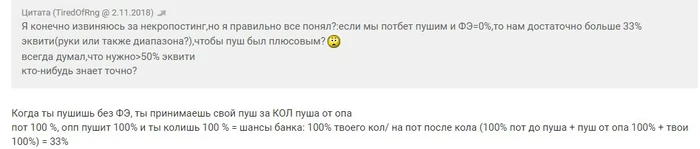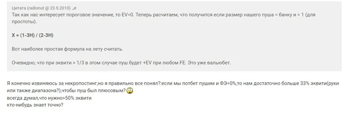 Я бегло посмотрел - на первый взгляд, всё верно выводит. Приходит к той же формуле, только записанной другими переменными X = (LV-WH)/(P + LV - WH). Но, как по мне, это чуть запутанней выглядит. Больше переменных используется: наше эквити, чужое эквити, стек плюс пот - вот это вот всё. А ведь её, по сути, можно свети к совсем простой формуле - (риск - EQ * итоговый пот) / (риск + вознаграждение - EQ * итоговый пот). Она интуитивно понятна: это та же самая формула необходимого фолдэквити для чистого блефа, с которой все знакомы, - только чуть подкорректированная. Мы на самом деле не рискуем, той частью итогового пота, которая нам принадлежит по эквити, поэтому вычитаем эту долю и из числителя, и из знаменателя. Или считаем ещё проще, по-житейски, как я описывал выше. Когда стеки по 100 бб, это вообще просто делается.