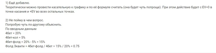 Благодаря этим формулам мы можем знать какое ФЭ с учётом эквити нам необходимо для прибыльного бета разным сайзом. Получится вот такой калькулятор: Free Fold Equity Calculator For Poker Players (redchippoker.com) , только в нём есть ещё одна часть формулы связанная с коллом рейза, 3бета... Может ты знаешь как добавить это действие в формулу ?