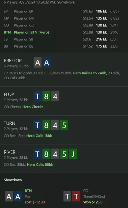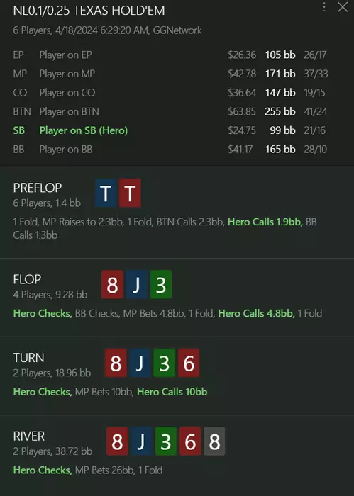 Еще заходил НЛ25 на покерке. Есть тут колл на ривере? MP пихает три банки, нашел только пары старше, вальты, да восмьерку. 3бет префлоп решил бы проблемы.