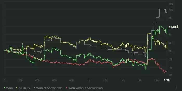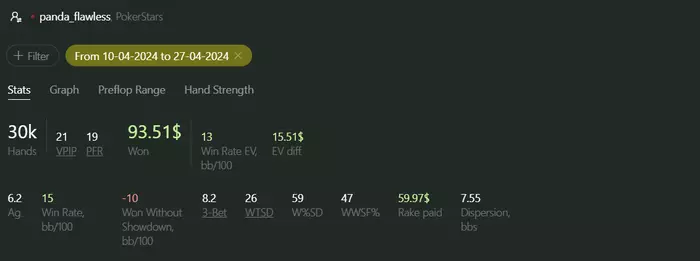 Сыграл 1.2к рук, почти минус полтора стека. В одной раздаче выбрал слишком дисперсионную линию, но её разбирать не буду. И так знаю что можно было сыграть там по другому. Разберу более интересные раздачи: