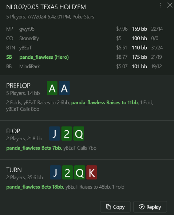 Во время этой сессии я применял довольно много агрессивных линий. Думаю, что делал блефов гораздо больше чем "нужно" с точки зрения равновесной игры. В будущем на более высоких лимитах я хочу иметь имидж очень агрессивного игрока, и как по мне сегодняшний день является хорошим началом пути к этому. Бтв самые мемные раздачи за сегодня (можете судить строго):
