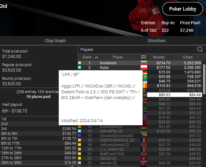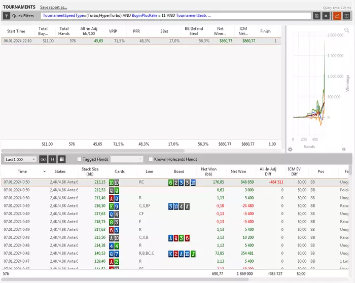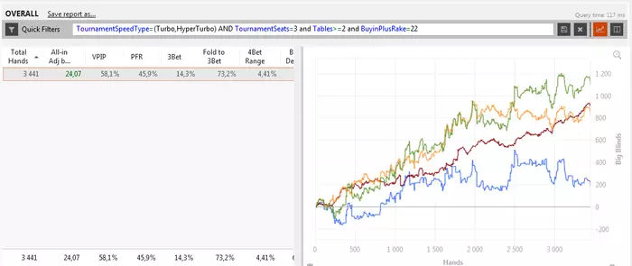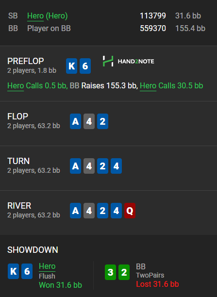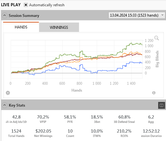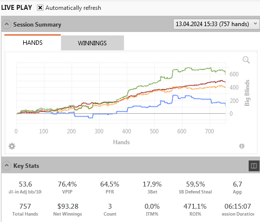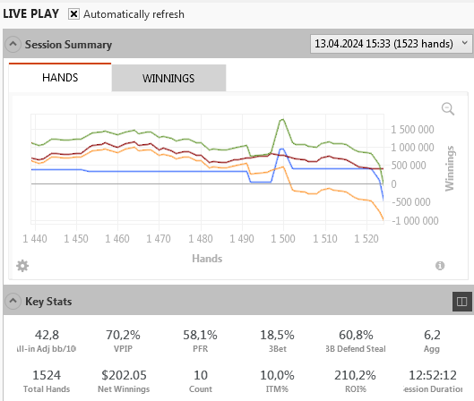 Собственно, пока что никакой дистанции не набрано, но ахуенные тенденции. Вылеты, как правило, идут при объективных кулерах и субъективных околокулерных спотах, когда либо какой-то фиш / активный фиш чек-пушит на сухом флопе, а у меня ТП2К-ОП, либо на опасных досках при фастплейе. Часто при этом есть увеличенное баунти.