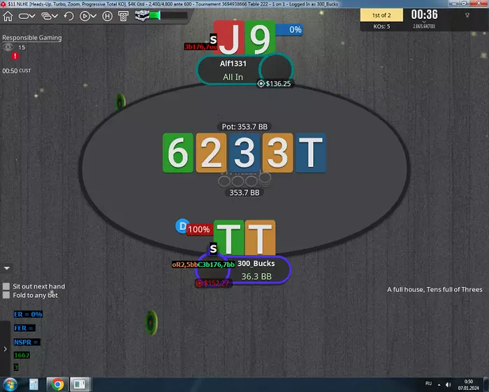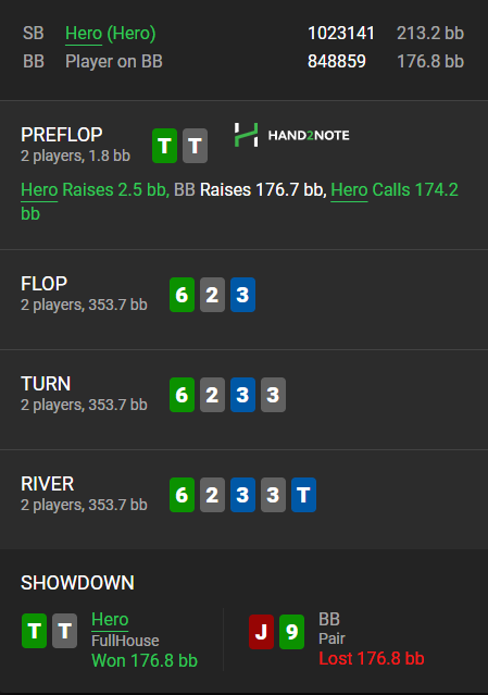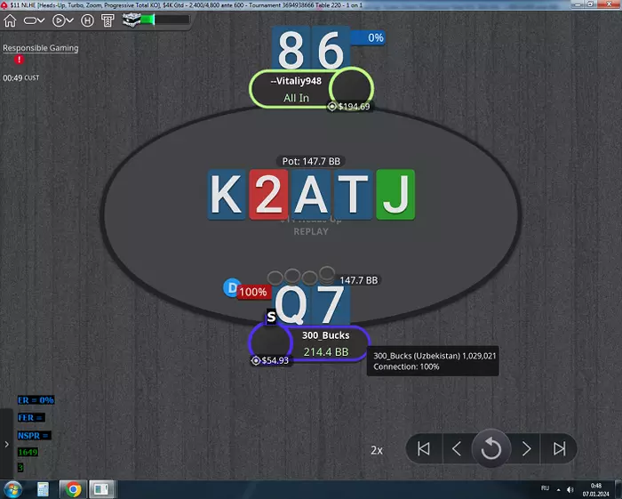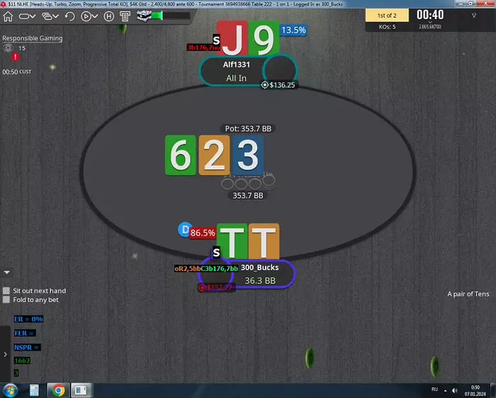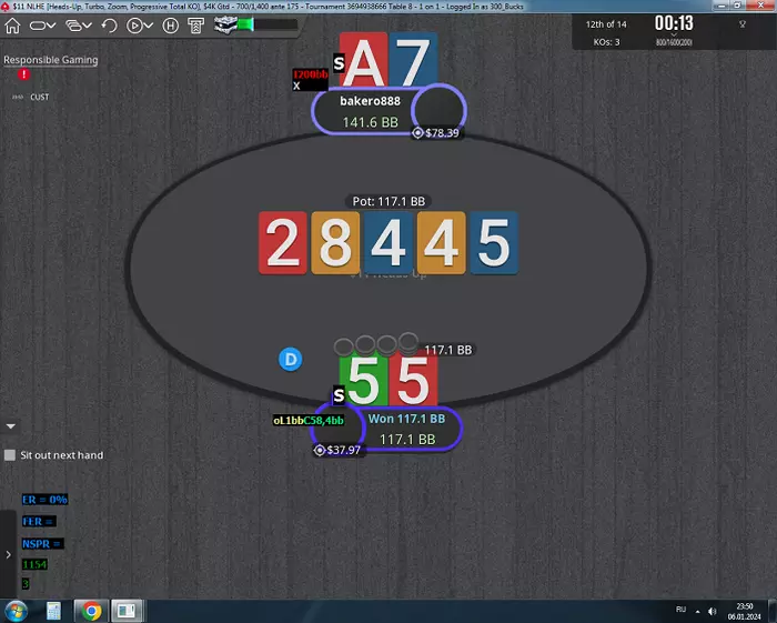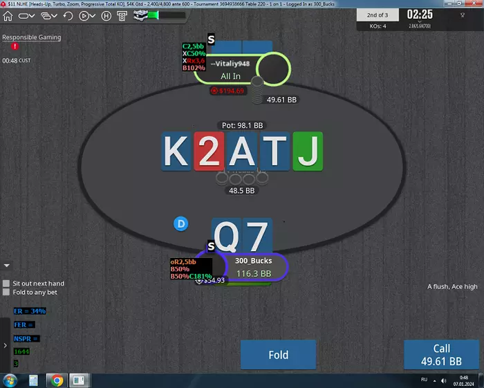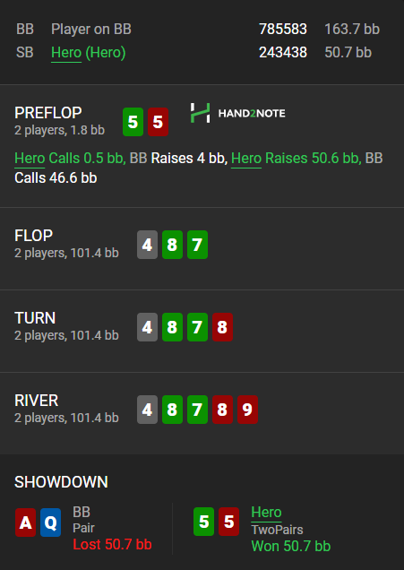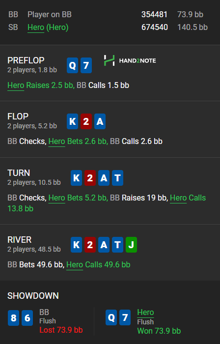 Как понятно, чем выше частота атаки, тем реже она подкреплена высоким эквити (идёт на мусоре, короче говоря). Как только мне зашли мне более-менее приемлемые карты, я убедил себя уехать (4-ый из 4-х) и закрыл его очередной "толчок" (не тот, на котором ты, наверняка, читаешь этот пост).