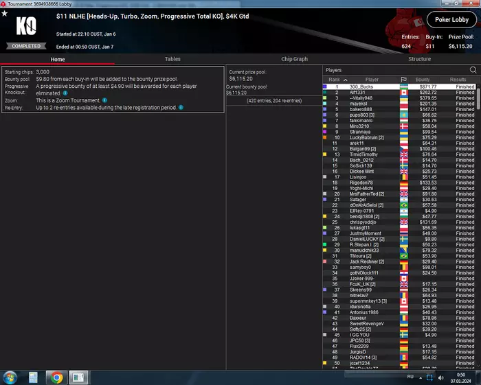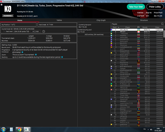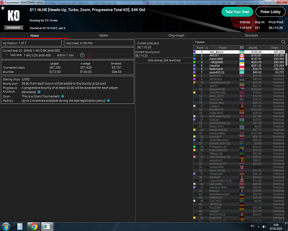 Как бы там ни было, я своей игрой больше чем доволен. Играть убеждающе и смело против 95% остальных противников - залог успеха. И учиться дальше. С бОльшим банкроллом это встанет на систему. Данный Zoom-3-max-22$-МТТ, к сожалению, стартует в неудобное мне время (в 1:45 ночи), но, авось PS сдвинут его на раньше и/или расширят сетку по таким турнирам. Те, которые есть в лобби за 2,2$ и за 11$ - там крошечные гарантии, и играть мне их неинтересно, учитывая что в Топ-3 я получу не так уж много.