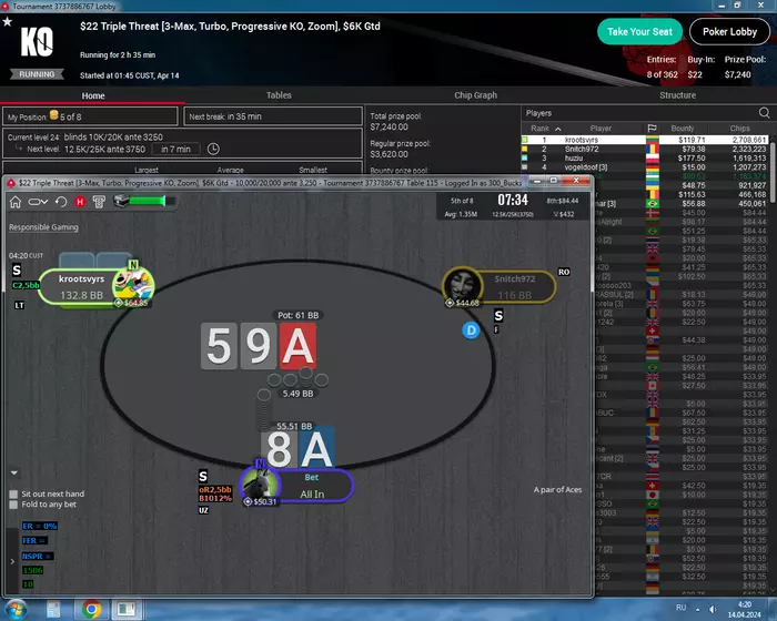 Но далее в лейт-гейме я воткнулся в (полу-)кулер и улетел на последнее место из оставшихся четверых с ~ 40 бб, что на в таких турнирах является огрызком.