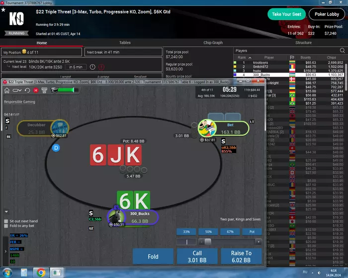 ... А в конце оставшихся 9-ых посадили за 3-max не_зум_столы, где оппоненты уже не меняются. И эти последние раздач 20 я играл самым коротким за столом (~70 bb) без позиции на этого самого чиплидера - несдающегося, коллдаунящего и агрессирующего. Объективно, мало что тут можно сделать (но я старался).