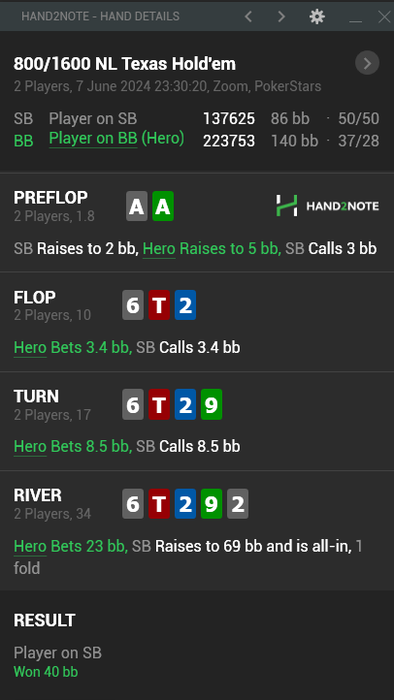 ХА-турнир: бет-фолд "АА" против рыбы в 3БП на ривере 6T292r