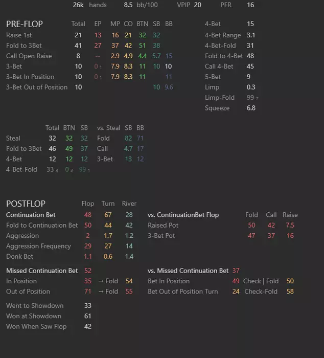 По графику могу сказать (из той компетенции, что имею на данный момент в техническом плане) - ты ультра пассивно играешь. Мне кажется есть лики абсолютно во всем. Оупены, 3беты, 4беты, к-беты, рейзы, ЧР.