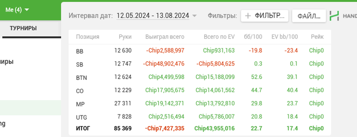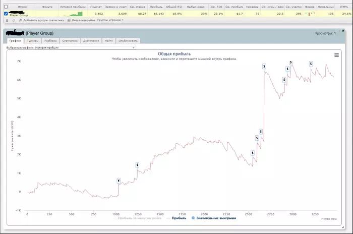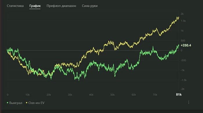 Занимаемся с Максом на постоянной основе уже почти месяц. На занятиях разбирали наигранную базу, топ-3 турнира(уже после начала тренировок). Помимо этого мы всегда на связи, можно скидывать раздачи в телегу. Обычно у меня после сессии пару десятков раздач набирается, и в экспресс режиме он дает анализ. Я бы порекомендовал брать треньки тем, кто уже давно жмет на кнопки играя в покер, но все же не понимает, почему то или иное действие нужно. Всего за одно занятие принцип мышления сразу меняется, а ев/бб ползет вверх .Скину график где желтая идет вверх после начала тренировок.