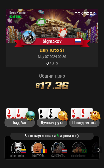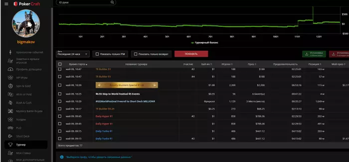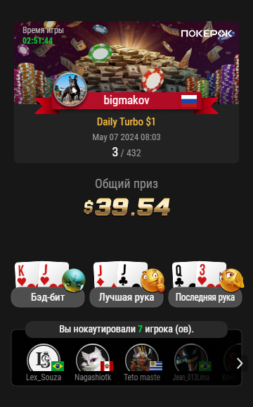 Васап, я давно здесь, редко пишу, читаю только. После всех уходов, я перестал депать. Чет зашел на стрим к VadimDanerian, а он там баксы турнирный разыгрывал, я не успел, он тупо мне 2 бакса засылает. Я такой, ну гоу, поехали. Месяц поднимался опускался до 20, редко играл. А я ж ну тупо знаю игру и время появилось. Еще я оч пертый по фрироллам. На ПС однаждны с нуля прошел 8 этапов играл на 5200, выебал какой-то знаменый хайроллер, там степы были, в Сочи проходил с фри, дали за 4 место 600баксов, как осадочному, но я был рад, вот позавчера прошел три этапа с фри, но на Кипр я и так бы не поехал, зато было круто поиграть за 2600 за хайроллерами, когда 6 столов по баксу и один за 2600))) Ща катаю норм с мая, бр 106, с утра докрутил в туриках две финалки. Идем дальше, катаю до бакса до 150 и дальше по лесенке. Историй много, думаю много чем вас порадую скоро. Сам занимаюсь видео. 40-50 туриков в день отыгрываю примерно, когда заряжен, сегодня в 5 утра встал, завезло с 12 туриков, поляна шикарная, решил отдохнуть.