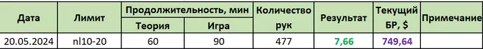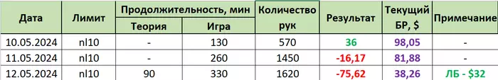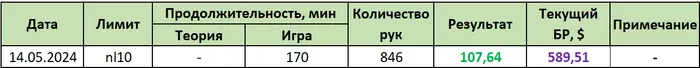 10.05.2024: 2 часа 10 мин, 570 рук, nl4-nl10 +$36.