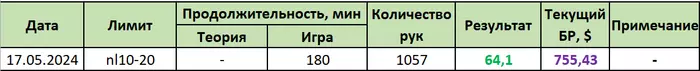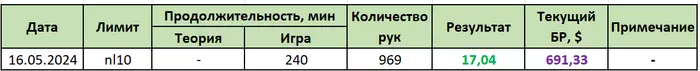 11.05.2024: 4 часа 20 мин, 1450 рук, nl10 -$16.