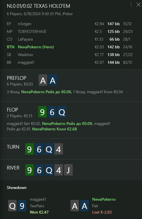 Привететствую! Вчера сыграл внезапно в минус 5 би. В основном проиграл выставления. Особенно вот это у меня вызвало сомнения. Надо было выбрасывать по хорошему, но опп фиш с впип 80. Я подумал, что он будет пихать любую даму, флешдро, даже королей залимпит. До этого он с мусором выставлялся и ему доезжало.