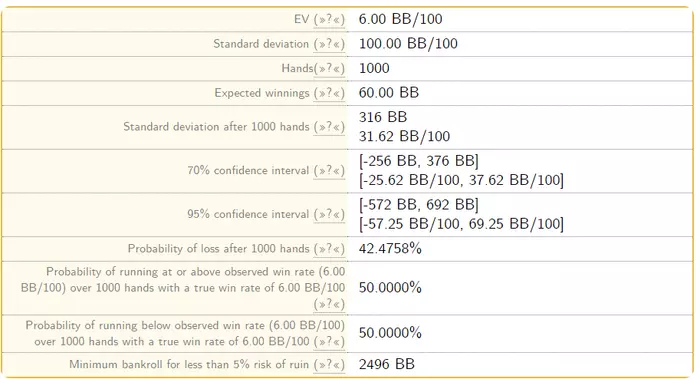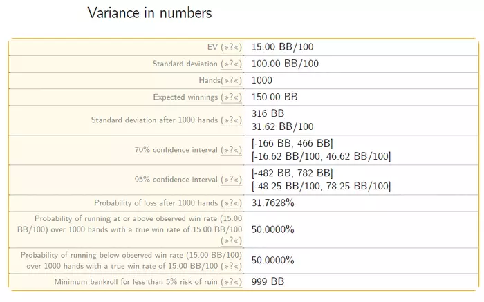 ladypopulet, Брат смотри цифры. Если ты играешь в 15 бб/100 (не играешь) то тебе нужно минимум 10БИ чтобы шанс закататься за 1к рук был меньше чем 5%)