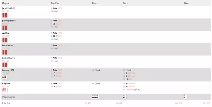 Игрок с JK часто играл чекрейзы и агрессировал в чек на флопе. С двумя парами я сыграл чек с надеждой забайтить на агрессию с картой, получил чек в ответ и дал ему добрать гатшот.
