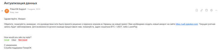Всем привет , 18 марта доехал на 120к в воскресной 525$ на PokerOK , в тот же день счет был заблокирован на проверку . Пришло письмо с просьбой подтвердить личность , всё довольно стандартно .За пару дней мне разблокировали счёт и попросили перейти на GGPokerUA, так как всех игроков с Украины они переводят туда .Деньги я мог выводить по 5к в несколько дней на крипту,меня всё устраивало . Спустя неделю началась война покерок с плюсовыми игроками (аля фондовскими) и мой случай уже пошел другим путем, попросили опять подтвердить личность и аккаунт зафризили повторно . Спустя неделю мне ответили что мой аккаунт покерок полностью закрывают так как я из Украины , деньги они отправят удобным мне способом . 9 апреля мне сказали что выведут мне деньги но как вы уже догадались денег всё нет . На письма отвечают раз через раз , два месяца назад должны были вот вот вывести по их словам но денег всё нет .